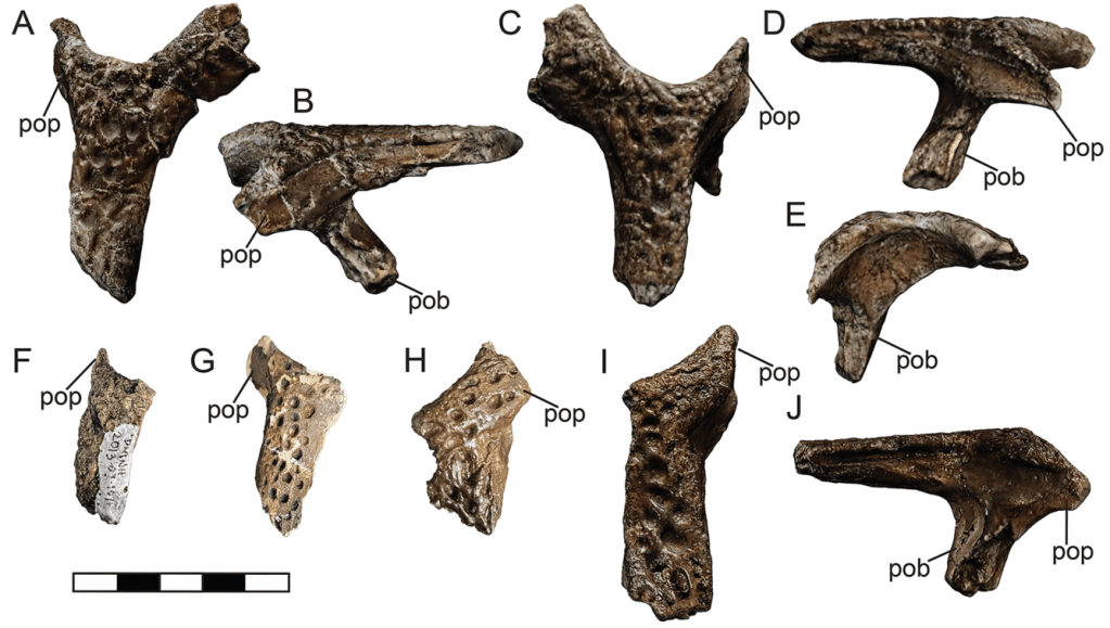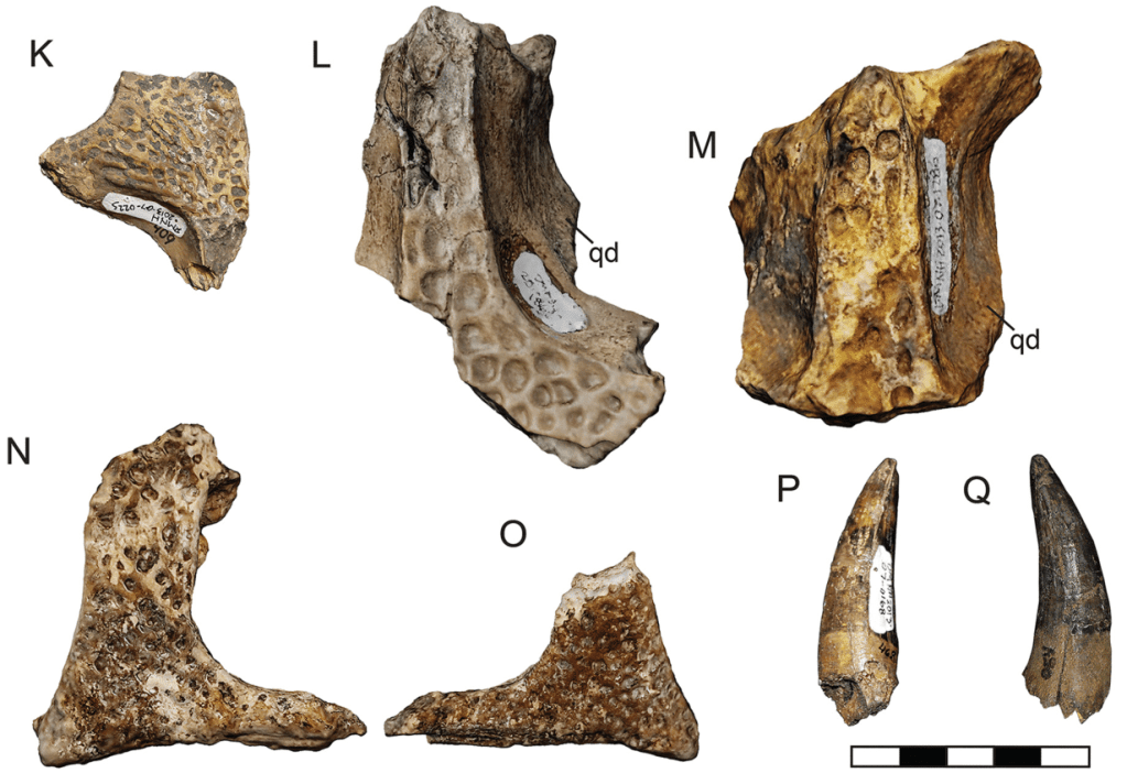Les spécimens décrits par Adams et ses collègues sont trois postorbitaux gauche isolés (DMNH 2013-07-1071, DMNH 2013-07-1885 et DMNH 2013-07- 1868), trois postorbitaux droit isolés (DMNH 2013-07-1873, DMNH 2013-07-0086 et DMNH 2013-07- 0331), un frontal gauche isolé (DMNH 2013-07-0225), deux pariétaux isolés (DMNH 2013-07-1863 et DMNH 2013-07-1286, deux squamosaux associés (DMNH 2013-07-0049a et DMNH 2013-07-0049b) ainsi que deux dents (DMNH 2013-07-0168 et DMNH 2013-07-0171). Ces spécimens appartiennent à au moins 3 individus différents, peut-être 5.