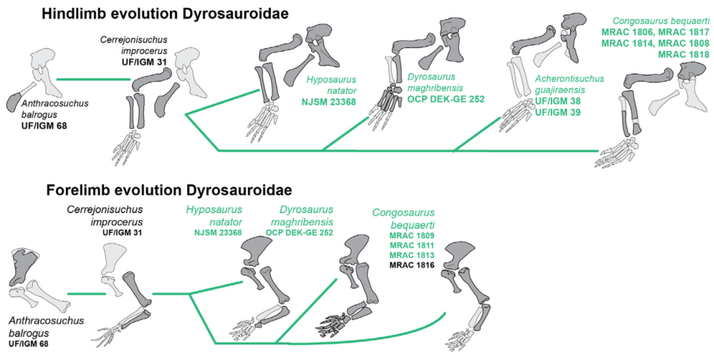 Enfin, Scavezzoni et Fischer notent que les dyrosauroidés présentent une évolution de leurs membres relativement conservative au niveau des proportions. Des changements légers dans la morphologie des os sont observables, mais les membres des dyrosauroidés ne se sont pas particulièrement allongés ou raccourcis. Cela peut aussi s’expliquer par le fait que l’histoire évolutive des dyrosauroidés est plus courte que celle des thalattosuchiens, ce qui ne leur a pas laissé le temps de développer des membres plus spécialisés.