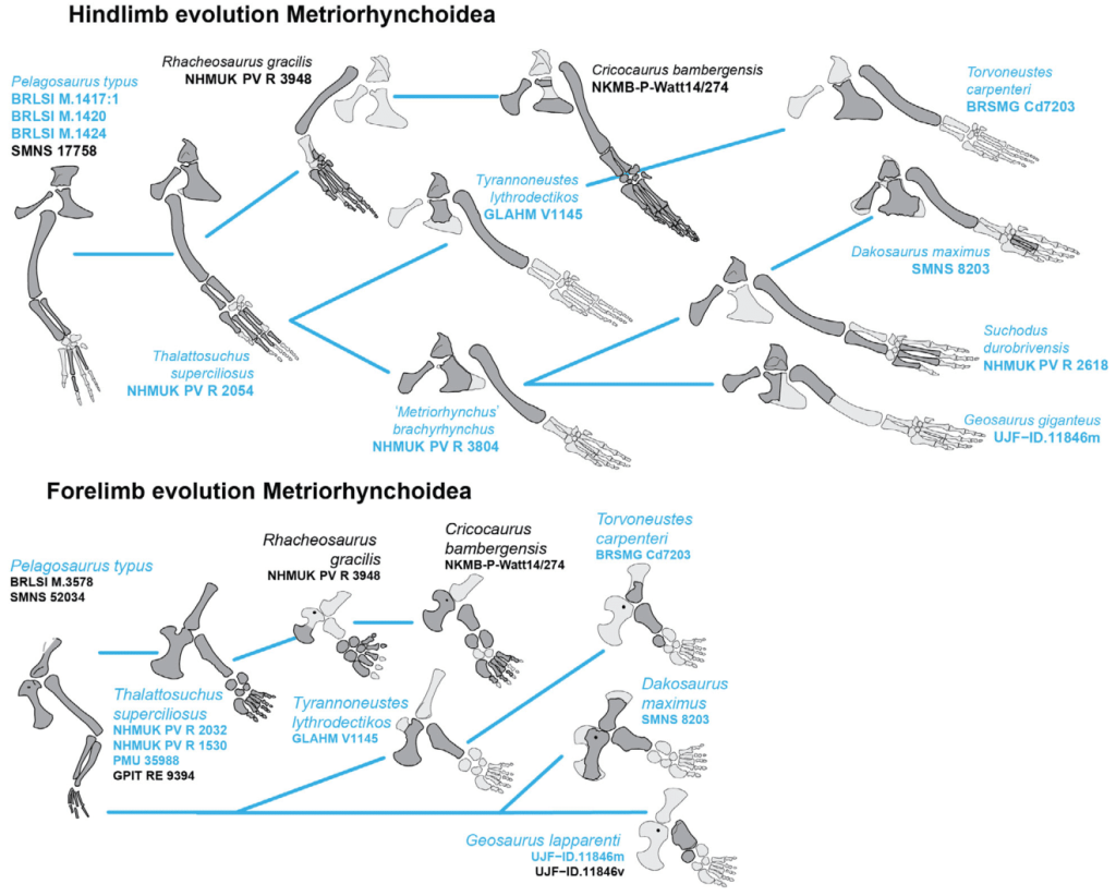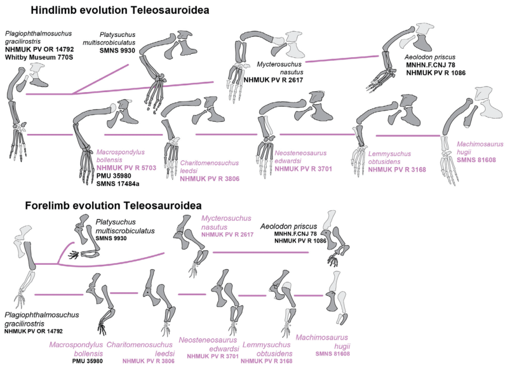 Dans leur étude, Scavezzoni et Fischer ont analysé l’évolution de la morphologie des membres au sein de chaque clade de crocodylomorphes marins fossiles. Les membres de Metriorhynchoidea ont développé une réduction de leurs membres antérieurs, mais aussi un allongement de leurs membres postérieurs. Ces adaptations pour la vie marine sont également apparues chez les oiseaux hesperonithiformes et les thalattosaures. Pour Scavezzoni et Fischer, les membres antérieurs réduits ont permis une diminution de la trainée, et une amélioration de l’hydrodynamisme. En revanche, l’augmentation de la taille des membres postérieurs a permis de leur donner un rôle de propulsion supplémentaire en plus de la queue.