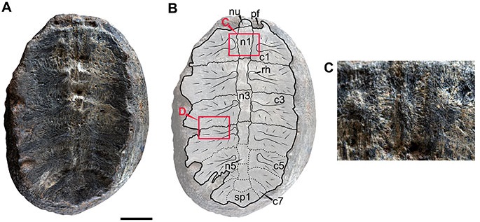 Références : Palma-Castro, H.D.; Cómbita-Romero, D.A.; Cadena, E.-A.; Carvalho, M.R., Herrera, F., 2023, An Early Cretaceous Sphenophyllum or a hatchling turtle? Palaeontologia Electronica. 26(3): a50.