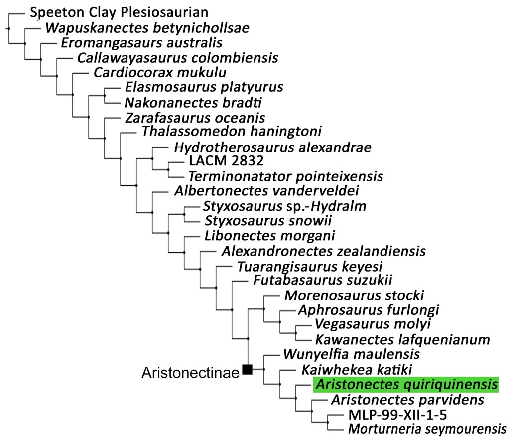 Otero signale également que SGO.PV.82 est un individu juvénile. Sa description détaillée permet de connaître des caractéristiques jusque là inconnues chez A. quiriquinensis. Otero a testé l’impact de ces découvertes sur la position phylogénétique de l’espèce. Son analyse révèle qu’Aristonectes quiriquinensis est un taxon plus basal qu’un clade composé de Morturneria et Aristonectes parvidens. Le genre Aristonectes y est donc paraphylétique. Cela signifie qu’A. quiriquinensis pourrait appartenir à un genre distinct d’A. parvidens. Otero note toutefois que donner un nouveau nom de genre pour A. quiriquinensis est pour l’instant inutile par manque de spécimens plus complets.