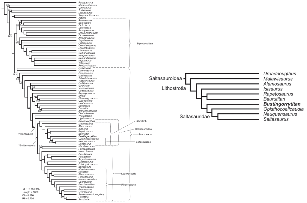 L’analyse phylogénétique de Simón et Salgado classe Bustingorrytitan comme un titanosaure lithostrotien, au sein de Saltasauroidea. Il s’y classe en taxon-soeur de Saltasauridae. Toutefois, cette phylogénie est aberrante par la position de plusieurs taxons et de plusieurs clades, et ne correspond pas au consensus actuel. Ainsi, la position de Bustingorrytitan mériterait d’être évaluée dans une nouvelle analyse phylogénétique. En attendant, il est préférable de le considérer comme un lithostrotien indéterminé.