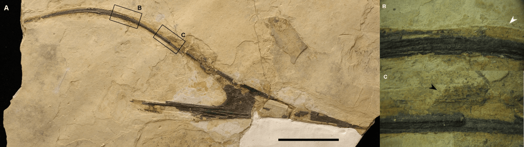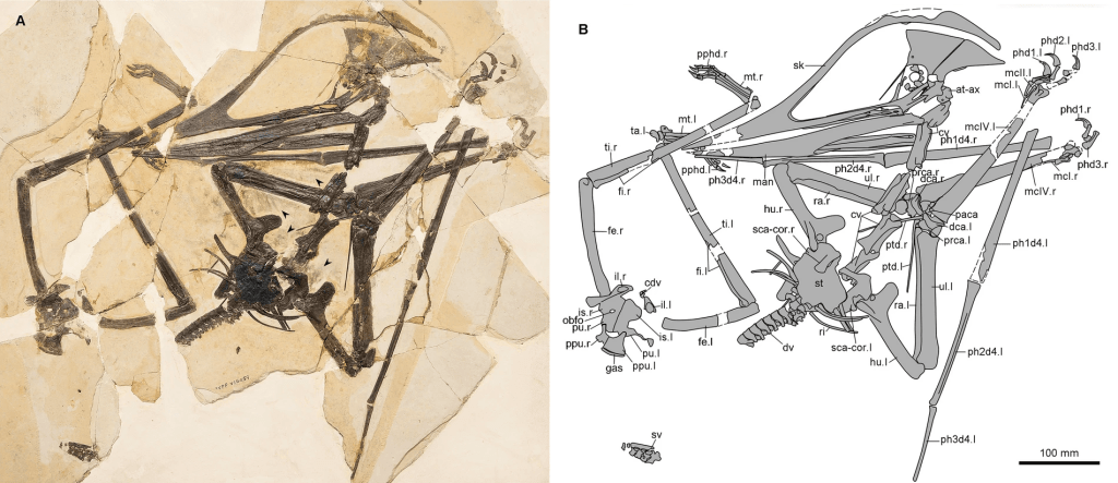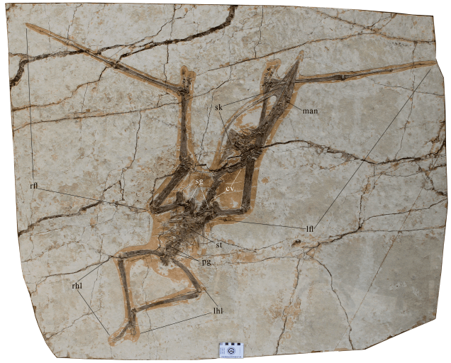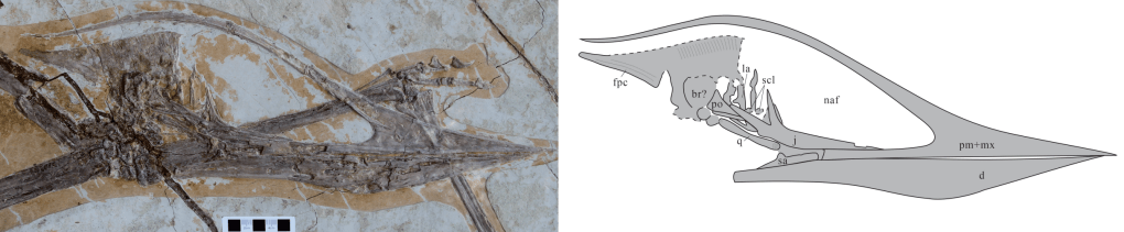 Références : Wang, X.; Kellner, A.W.A.; Jiang, S.; Chen, H.; Costa, F.R.; Cheng, X.; Zhang, X.; Vila Nova, B.C.; Campos, D.A.; Sayão, J.M.; Rodrigues, T.; Bantim, R.A.M.; Saraiva, A.A.F.; Zhou, Z., 2023, A new toothless pterosaur from the Early Cretaceous Jehol Biota with comments on the Chaoyangopteridae. Science Reports. 13: 22642.