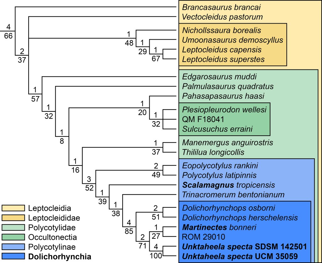 Références : Clark, R.O.; O’Keefe, F.R.; Slack, S.E., 2023, A new genus of small polycotylid plesiosaur from the Upper Cretaceous of the Western Interior Seaway and a clarification of the genus Dolichorhynchops. Cretaceous Research. 105812.