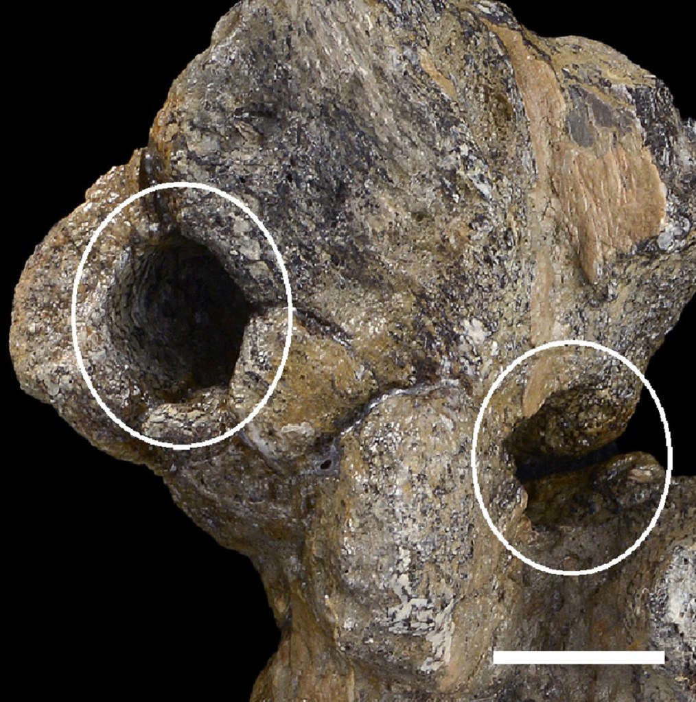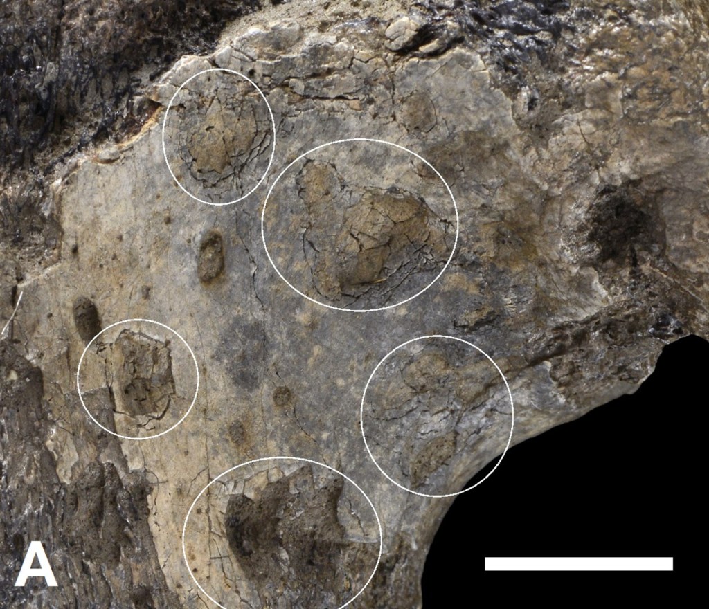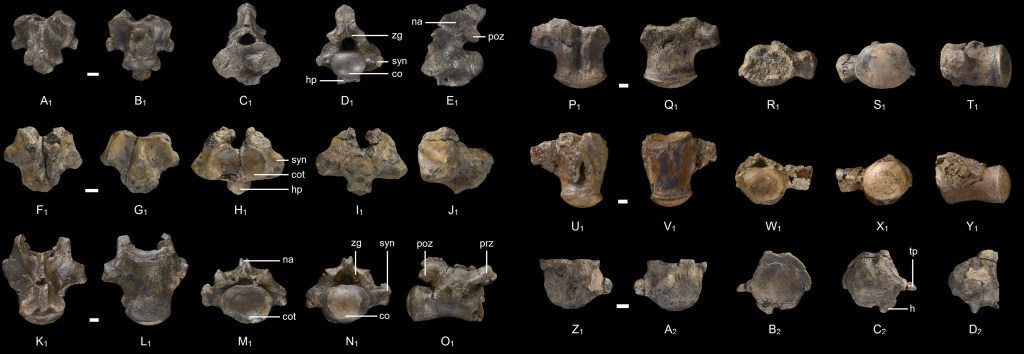 Des perforations de plus grande taille sont présentes sur deux vertèbres dorsales (UP.SGN.37 et UP.SGN.38) et sur une vertèbre caudale (UP.SGN.31). Il s’agit de marques de dents de forme conique. Plasse et ses collègues considèrent que les auteurs potentiels de ces marques sont les crocodylomorphes, les mosasauridés ou les gros poissons téléostéens. Etant donné que les crocodylomorphes marins et les gros poissons téléostéens sont absents d’Europe au Santonien, il semble plus probable que ces perforations de grande taille aient été produites par des morsures de mosasauridés.