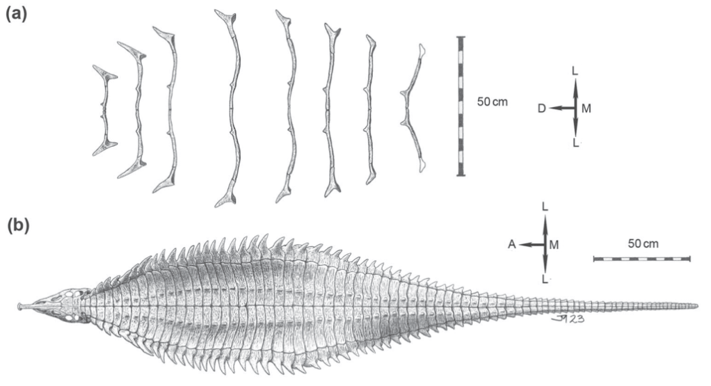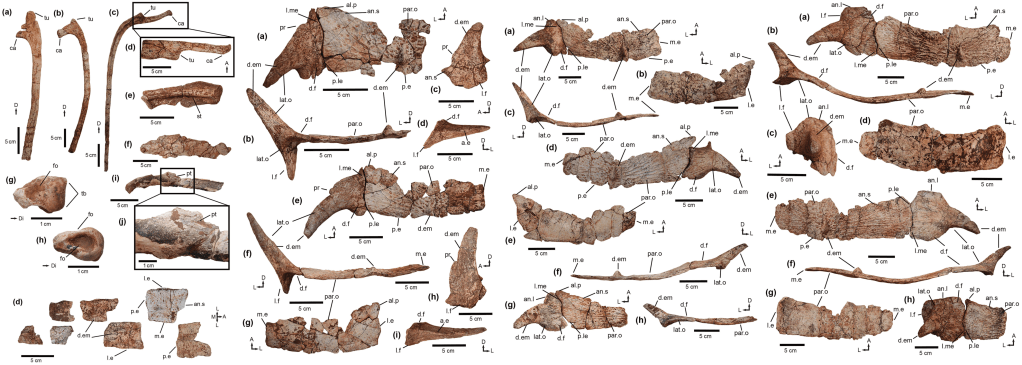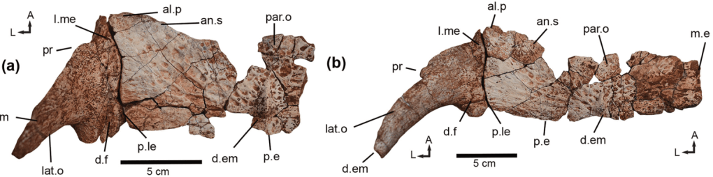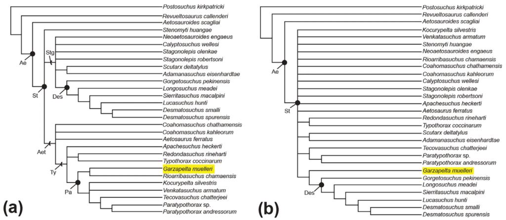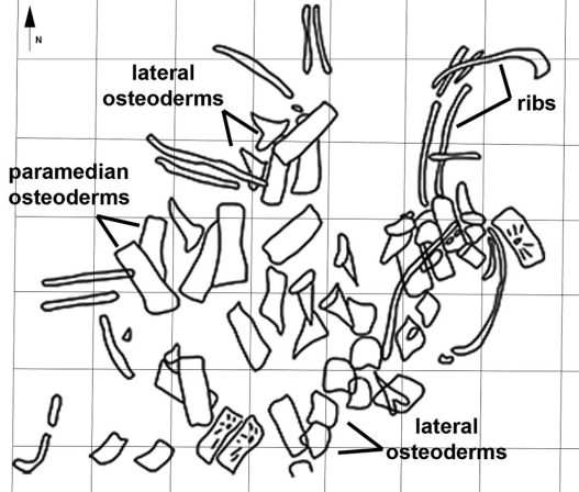 Références : Reyes, W.A.; Martz, J.W.; Small, B.J., 2024, Garzapelta muelleri gen. et sp. nov., a new aetosaur (Archosauria: Pseudosuchia) from the Late Triassic (middle Norian) middle Cooper Canyon Formation, Dockum Group, Texas, USA, and its implications on our understanding of the morphological disparity of the aetosaurian dorsal carapace. The Anatomical Record. e25379.