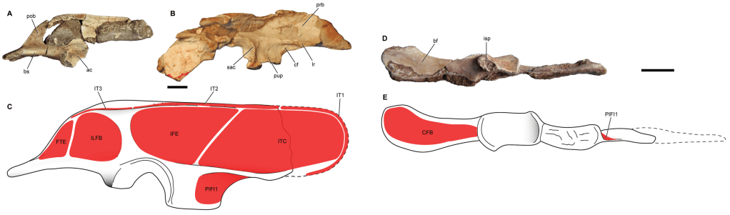 Références : Gianechini, F.A.; Colli, L.; Makovicky, P.J., 2024, Pelvic and hindlimb muscular reconstruction of the paravian theropod Buitreraptor gonzalezorum and its palaeobiological implications. Historical Biology.