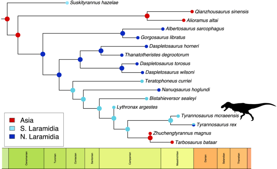 L’analyse phylogénétique de Dalman et ses collègues a classé Tyrannosaurus mcraeensis en taxon-soeur de T. rex. Elle retrouve une phylogénie classique pour les tyrannosauridés. Dalman et ses collègues notent que T. mcraeensis présente plusieurs caractères dérivés que T. rex ne présente pas. Cela indique que T. mcraeensis était une branche distincte de T. rex dans l’évolution de Tyrannosaurus. Tyrannosaurus mcraeensis n’était donc pas l’ancêtre direct de Tyrannosaurus rex.