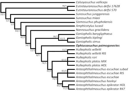 López-Rojas et ses collègues ne mentionnent pas les dents ML 2422-2472 ni le squelette ML 2555. En effet, il n’est actuellement pas possible de donner une attribution taxonomique précise à des dents isolées de goniopholididés. Le squelette ML 2555 est un spécimen juvénile qui ne présente pas de matériel qui se chevauche avec l’holotype (ML 2776) d’Ophiussasuchus paimogonectes. Pour attribuer ML 2555 à Ophiussasuchus, il est nécessaire de décrire un spécimen permettant sa comparaison avec le genre. Malgré tout, Ophiussasuchus est le seul taxon décrit de la formation géologique de Lourinhã, ce qui rend probable le fait que les dents ML 2422-2472 et le squelette ML 2555 représentent O. paimogonectes.