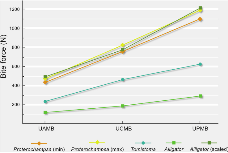 de Simão-Oliveira et ses collègues ont estimé que la force d’une morsure antérieure de Proterochampsa était de 435 à 472 N. Pour une morsure médiane, cette force serait d’entre 758 et 822 N. Enfin, la force d’une morsure postérieure de Proterochampsa serait comprise entre 1098 N et 1191 N. Cette force de morsure est proportionnellement similaire à celle d’un alligator moderne et plus élevée que celle du faux-gavial. Proterochampsa mordait donc le plus fort avec l’arrière de sa mâchoire, avec une force allant jusqu’à presque 1200 N. Pour donner un ordre de grandeur, c’est une force légèrement plus faible que la morsure d’un loup actuel.