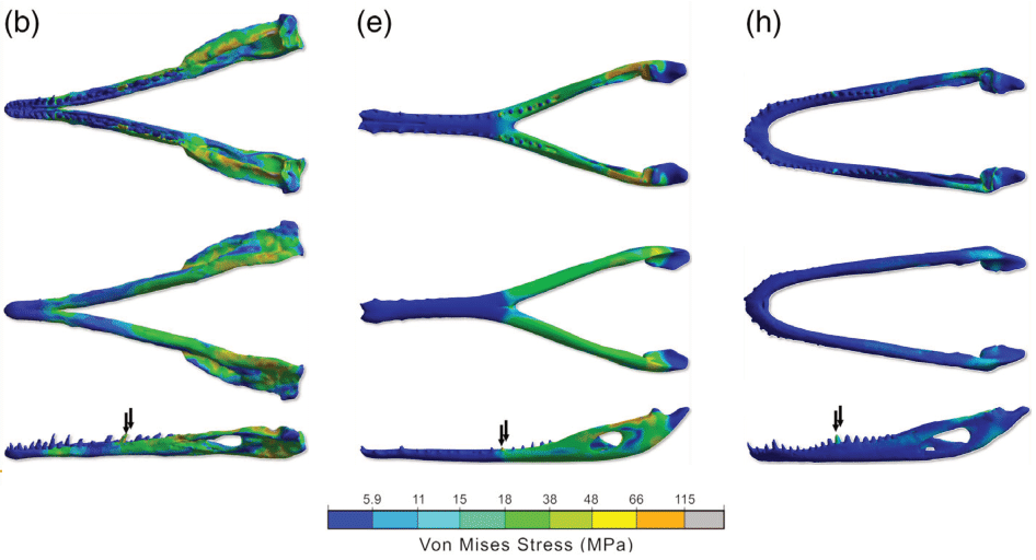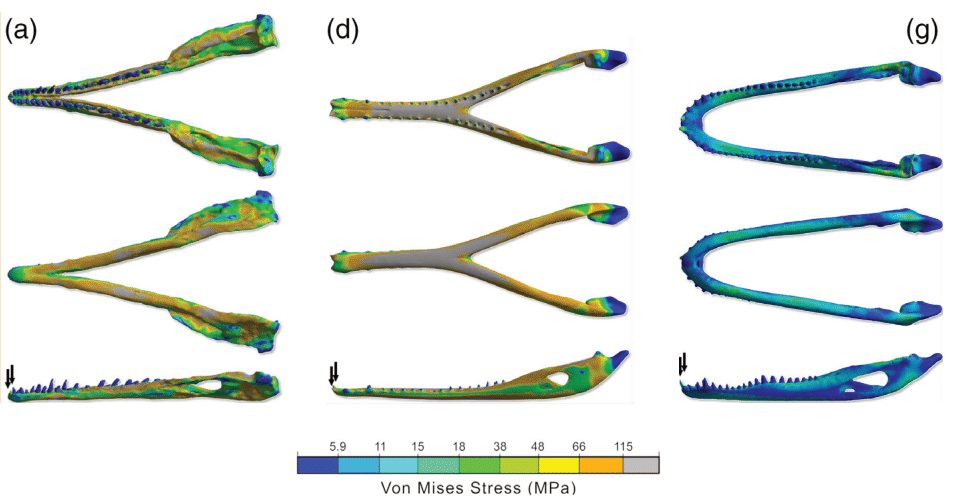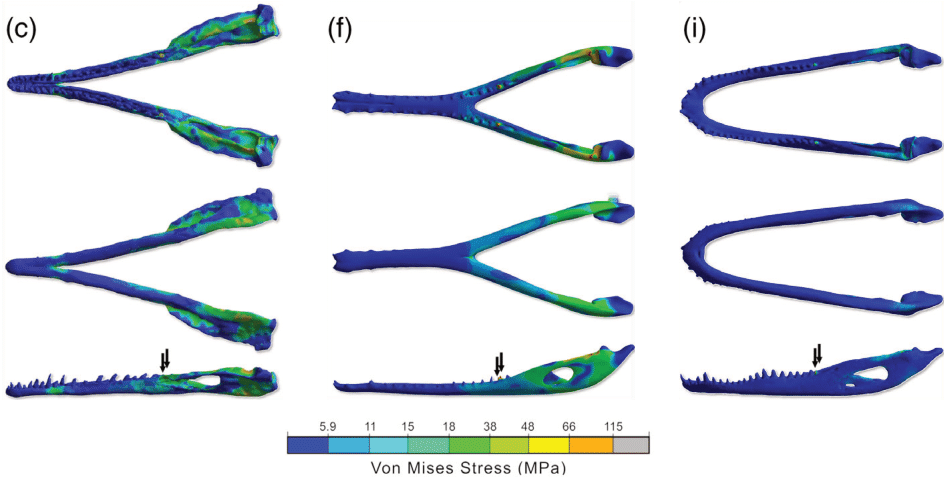 La méthode des contraintes de von Mises permet de connaître les actions optimales au niveau biomécanique, indiquant quels mouvements Proterochampsa était susceptible de faire ou de ne pas faire. de Simão-Oliveira et ses collègues analysé les cas d’une morsure antérieure, d’une morsure médiane et d’une morsure postérieure. Ils ont ensuite comparé les résultats obtenus avec ceux obtenus pour un crâne de faux-gavial (Tomistoma schlegelii) et un crâne d’alligator d’Amérique (Alligator mississippiensis).