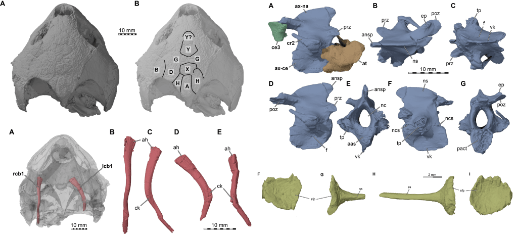 Spicher et ses collègues analysent ensuite le crâne holotype (DMNH EPV. 96000) de S. gilberti, à l’aide de scans CT. Ces scans permettent de visualiser en détail la morphologie du crâne de Saxochelys, et donc d’améliorer nos connaissances sur ses caractéristiques. Ils ont notamment pu déterminer le motif de certaines de ses écailles crâniennes et visualiser l’appareil hyoïde. Ces scans ont également permis de constater la présence des trois premières vertèbres cervicales à l’intérieur du spécimen. Spicher et ses collègues en concluent que l’holotype (DMNH EPV. 96000) de Saxochelys gilberti se compose désormais du crâne complet, de trois vertèbres cervicales et de la carapace complète.