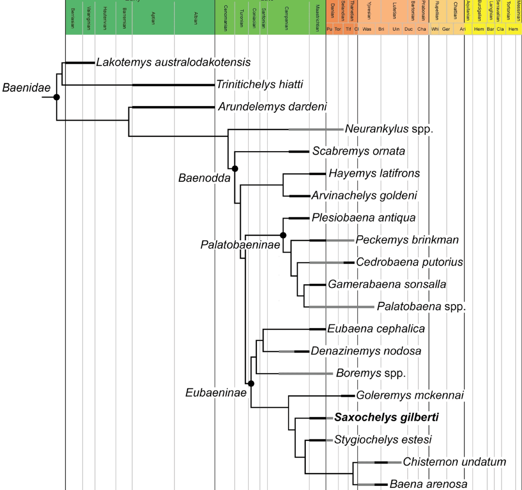 Lyson, T.R.; Sayler, J.L.; Joyce, W.G., 2019, A new baenid turtle, Saxochelys gilberti, gen. et sp. nov., from the uppermost Cretaceous (Maastrichtian) Hell Creek Formation: sexual dimorphism and spatial niche partitioning within the most speciose group of Late Cretaceous turtles. Journal of Vertebrate Paleontology. 39: 4.