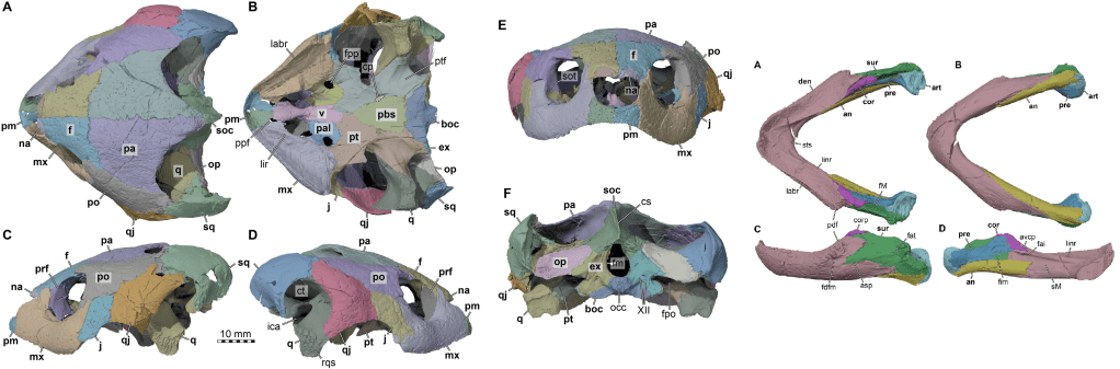 Références : Spicher, G.E.; Lyson, T.R.; Evers, S.W., 2024, Updated cranial and mandibular description of the Late Cretaceous (Maastrichtian) baenid turtle Saxochelys gilberti based on micro-computed tomography scans and new information on the holotype-shell association. Swiss Journal of Palaeontology. 143: 2.