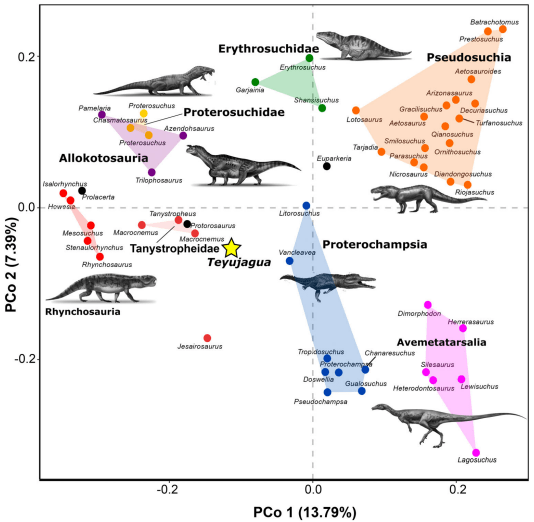 de Oliveira et ses collègues ont également réalisé une analyse morphométrique pour évaluer la diversité et la disparité morphologique des archosauromorphes. Dans cette analyse, Teyujagua se retrouve dans un morphospace distinct de tous les autres membres d’Archosauromorpha. Sa morphologie générale n’a donc pas de grandes similitudes avec un genre ou un groupe déjà connus. Le fait que Teyujagua occupe son propre morphospace pourrait indiquer qu’il avait développé des spécialisations pour occuper un rôle écologique bien distinct des autres archosauromorphes.