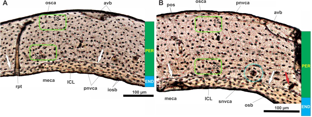 Références : Kundrát, M.; Horváth, D.; Wang, Z.; Wang, X., 2024, Developmental distribution of osteocyte lacunae in the limb bone cortex of Musivavis amabilis with a review of bone microstructure adaptations in Enantiornithes. Cretaceous Research. 105839.