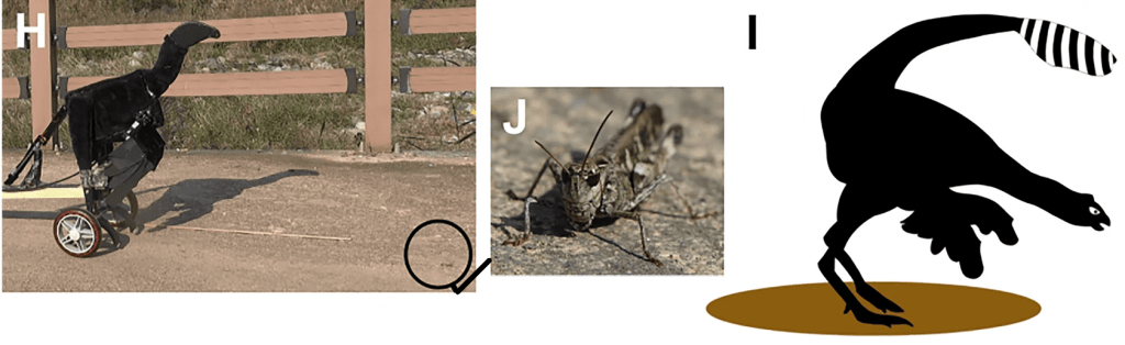 Park et ses collègues ont testé l’hypothèse que certains théropodes Pennaraptora basaux chassaient eux aussi de cette manière. Ils ont construit un robot reproduisant la forme de Caudipteryx, un oviraptorosaure caudipteridé, sachant que les oviraptorosaures sont les Pennaraptora les plus basaux. Park et ses collègues ont fait agiter les « plumes » du robot devant des sauterelles vivantes, afin d’enregistrer leurs réponses nerveuses. Il en résulte que l’agitation des « plumes » entraîne une plus grande proportion de fuite des sauterelles, confirmant que l’hypothèse de Park et ses collègues est viable.