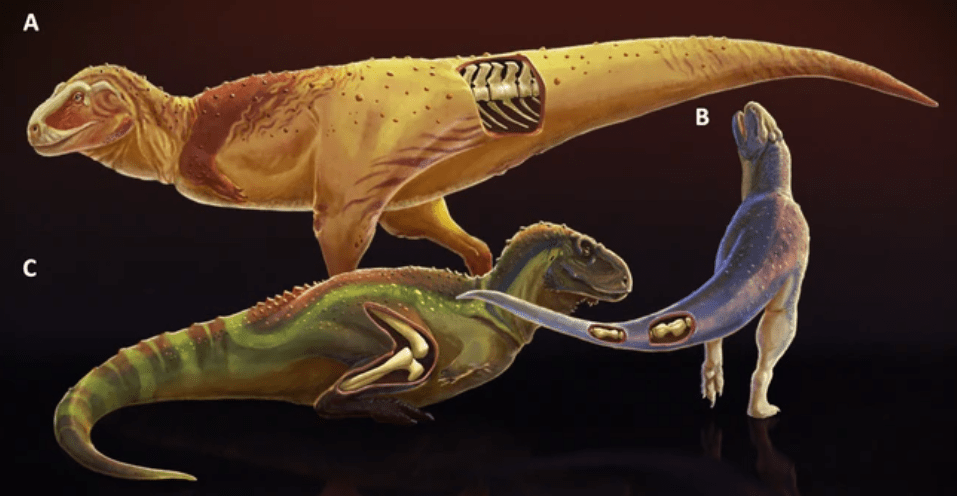 Les abelisauridés sont une famille de théropodes particulièrement abondante dans le crétacé supérieur d’Amérique du Sud. Aucasaurus, Elemgasem et Quilmesaurus sont trois abelisauridés d’Amérique du Sud présentant des pathologies jusque là non décrites. Aucasaurus provient du Campanien de la formation géologique d’Anacleto (Neuquén, Argentine), Elemgasem du Turonien-Coniacien de la formation géologique de Portezuelo (Neuquén, Argentine) et Quilmesaurus du Campanien-Maastrichtien de la formation géologique d’Allen (Río Negro, Argentine). Baiano et ses collègues décrivent ainsi les pathologies affectant Aucasaurus, Elemgasem et Quilmesaurus.