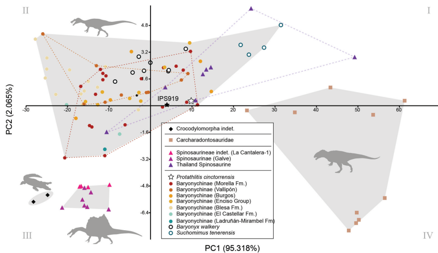 Le spécimen décrit par Montealegre et ses collègues est une dent isolée (IPS919) qui préserve la couronne et une partie de la racine. IPS919 présente une morphologie typique des dents des spinosauridés. Afin de préciser son attribution taxonomique, Montealegre et ses collègues ont effectué une analyse morphométrique. Cette analyse place IPS919 dans le morphospace des dents de baryonychinés de la formation géologique d’Arcillas de Morella ainsi que celui de la dent de Protathlitis. Montealegre et ses collègues décident donc de référer IPS919 à cf. Protathlitis sp.