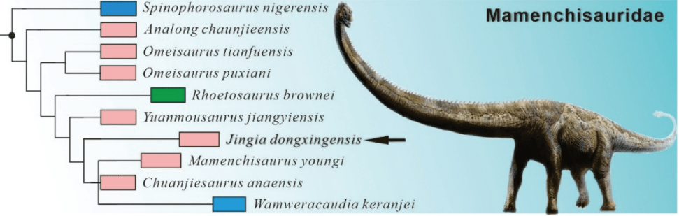Ren et ses collègues ont classé Jingiella au sein de Mamenchisauridae, dans une position assez dérivée mais plus basale qu’un clade composé de Wamweracaudia, Mamenchisaurus et Chuanjiesaurus. A noter que Ren et ses collègues retrouvent les genres Spinophorosaurus et Rhoetosaurus au sein de Mamenchisauridae. Jingiella est donc l’un des mamenchisauridés les plus jeunes connus, mais aussi l’un des plus dérivés.