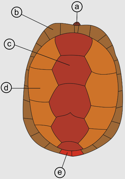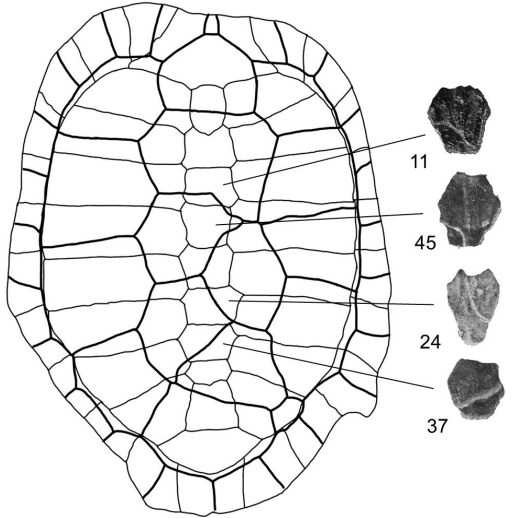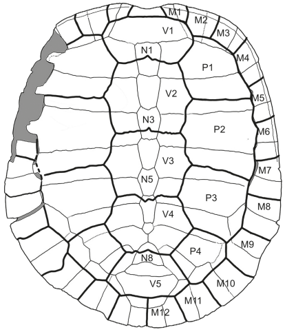 La variation du motif des écailles vertébrales des carapaces des tortues présentent trois types de variations : l’ajout d’une écaille, la suppression d’une écaille ou une irrégularité dans l’arrangement des écailles. Ces phénomènes sont dus à des anomalies de développement embryonnaire des tortues. Les écailles des tortues se développent grâce à des placodes (tissus épidermique) dont la position est liée à la segmentation des somites. Les anomalies apparaissent quand les placodes se situent sur de mauvais somites. Etant donné que ce motif n’est pas essentiel à la survie des tortues, ces anomalies ne sont pas supprimées par la sélection naturelle et se retrouvent fréquemment chez les tortues actuelles.
