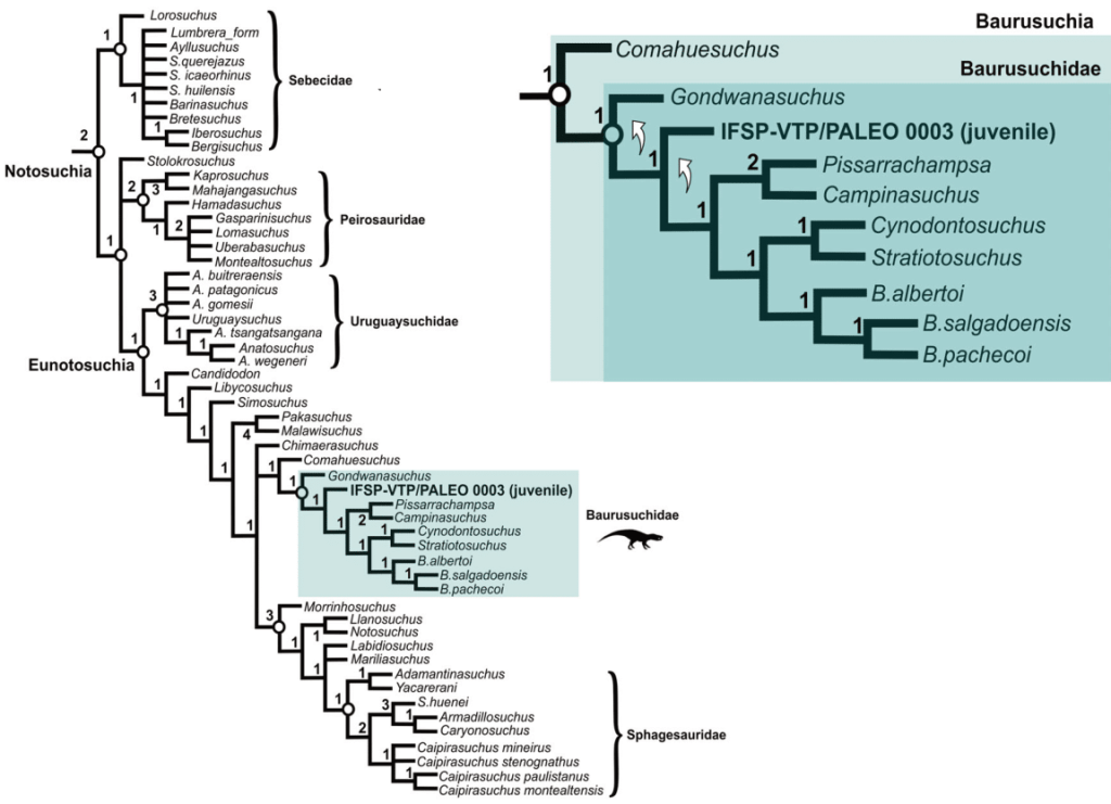 Santos et ses collègues ont effectué une analyse phylogénétique, afin de connaître la position d’un spécimen juvénile de baurusuchidé au sein de Baurusuchidae. Ils constatent que IFSP-VTP/ PALEO-0003 est classé comme un baurusuchidé basal. Cela n’est pas surprenant car les spécimens juvéniles d’un taxon ont toujours tendance à se placer dans une position plus basale que les adultes du même taxon.