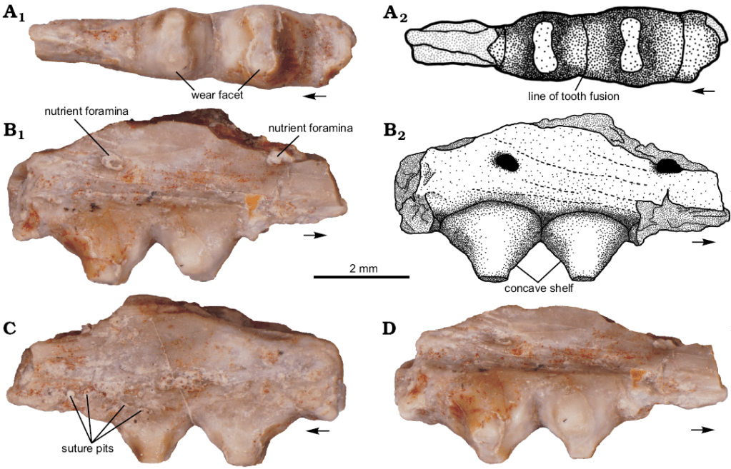 Références : Jenkins, K.M.; Bell, C.J.; Hancox, P.J.; Lewis, P.J., 2024, A new species of Palacrodon and a unique form of tooth attachment in reptiles. Journal of Vertebrate Paleontology. e2328658.