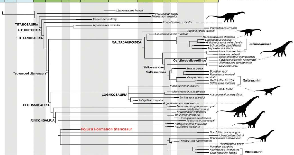 Le spécimen de titanosaure décrit par Bandeira et ses collègues est un centrum caudal (NHM-PV R.2129(a)) découvert dans le Hauterivien-Barrémien de la formation géologique de Pojuca. Il a été surnommé « Pojuca Formation Titanosaur » et sa morphologie le rapproche des Aeolosaurini. L’analyse phylogénétique de Bandeira et ses collègues a classé le « Pojuca Formation Titanosaur » comme un membre basal mal résolu de Rinconsauria. En raison de sa nature isolée, il a simplement été référé à Lithostrotia indet.