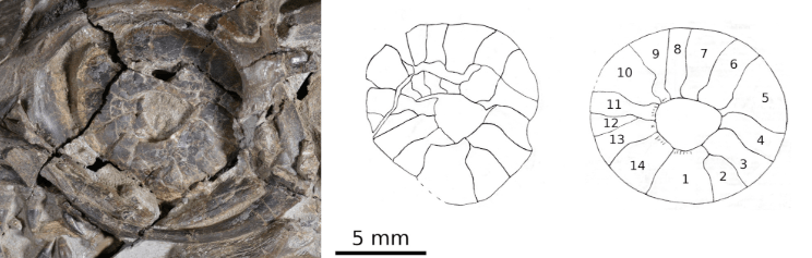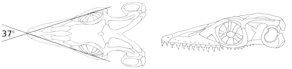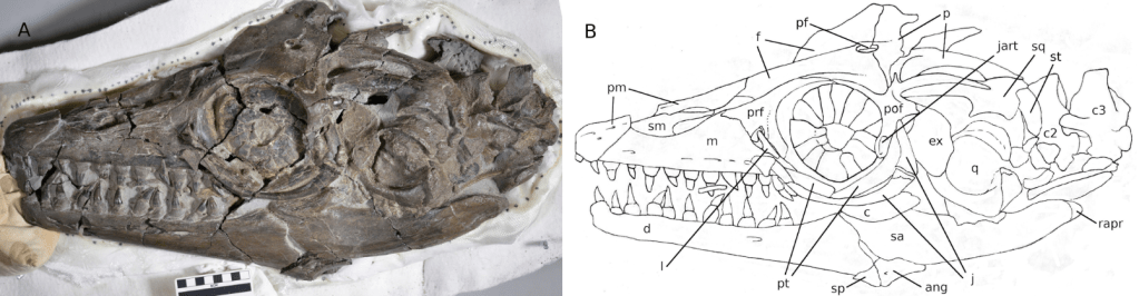 Référence : Holmes, R.B., 2024, Evaluation of the photosensory characteristics of the lateral and pineal eyes of Plioplatecarpus (Squamata, Mosasauridae) based on an exceptionally preserved specimen from the Bearpaw Shale (Campanian, Upper Cretaceous) of southern Alberta. Journal of Vertebrate Paleontology. e2335174.