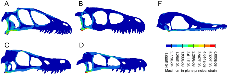 Tse et ses collègues ont identifié trois types de réactions face aux contraintes de von Mises. Chez les dromaeosaurinés, une morsure engendre un stress mécanique important à l’arrière crâne, alors que chez les velociraptorinés, une morsure engendre un stress mécanique important le long des bords dorsal et ventral du crâne. Enfin, Halszkaraptor présente un stress mécanique important à l’arrière de la mâchoire et à l’extrémité ventrale de l’orbite.