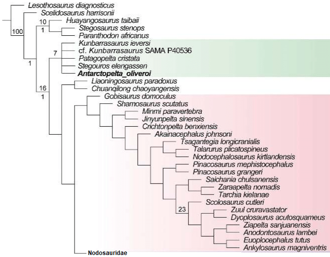 La redescription détaillée de MLP-PV 86-X-28-1 permet à Soto-Acuña et ses collègues de donner un diagnostic plus précis à Antarctopelta oliveroi. Elle leur permet également d’effectuer une analyse phylogénétique afin de tester l’impact de leurs résultats sur le classement d’Antarctopelta. Il en résulte qu’Antarctopelta est placé dans une polytomie au sein de Parankylosauria. A noter que Patagopelta est également membre de Parankylosauria alors qu’il était précédemment considéré comme un nodosauridé (voir cet article).
