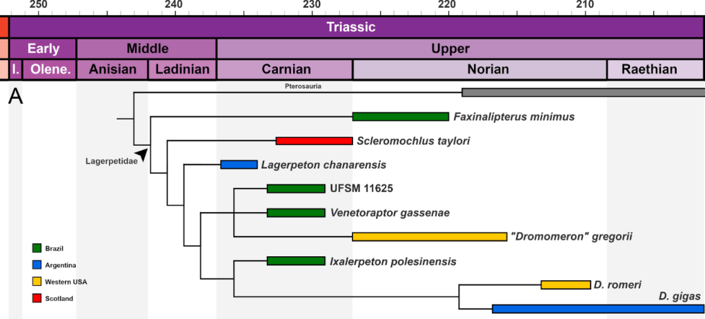 Les lagerpetidés sont une famille d’avemetatarsaliens pterosauromorphes connus du trias supérieur d’Europe, d’Afrique et d’Amérique. Dans le Carnien de la formation géologique de Santa Maria (Rio Grande do Sul, Brésil), ils sont représentés par les genres Venetoraptor et Ixalerpeton ainsi que par plusieurs spécimens isolés. Garcia et ses collègues décrivent ainsi deux nouveaux spécimens de lagerpetidés découverts en 2018 et en 2020 dans la formation géologique de Santa Maria.