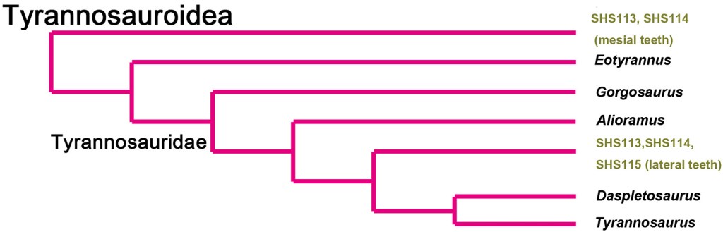 Les spécimens décrits par Xing et ses collègues sont 4 dents plus ou moins complètes (SHS 113, SHS 114, SHS 115 et ZDSD-D-T-001). Leurs caractéristiques permettent de les référer avec confiance à Tyrannosauridae. Xing et ses collègues confirment leurs observations avec des analyses phylogénétique et morphométrique classant ces dents chez Tyrannosauridae. Leur nature isolée ne permet pas de savoir si elles appartiennent à un taxon connu comme Qianzhousaurus, ou s’il s’agit d’un nouveau taxon. Xing et ses collègues attribuent donc SHS 113, SHS 114, SHS 115 et ZDSD-D-T-001 à Tyrannosauridae indet.