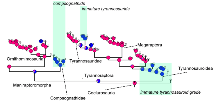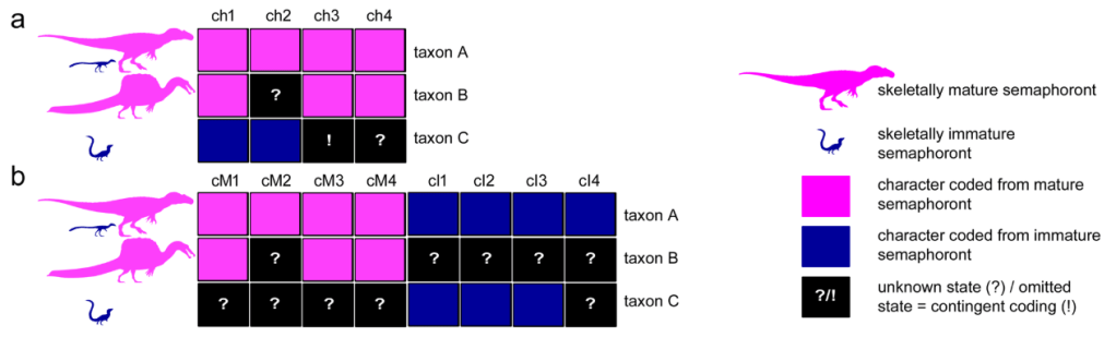 Les taxons de théropodes basés sur des spécimens immatures sont souvent difficiles à classer dans une analyse phylogénétique car leurs caractéristiques sont souvent liées à leur stade ontogénique. Il est donc souvent difficile de relier ces taxons au groupe auquel ils appartiennent réellement, car ces groupes sont définis sur la base de spécimens adultes. Une mauvaise interprétation de ces caractéristiques peut ainsi mener à des classements erronés voire à la création de clades artificiels Cau développe ainsi une méthode pour prendre en compte l’immaturité des spécimens dans les analyses phylogénétiques des théropodes.