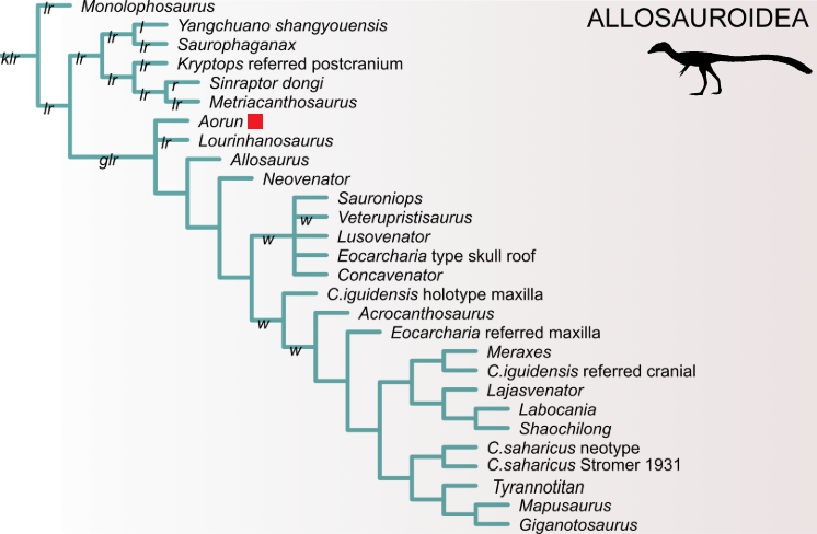 L’analyse de Cau a également modifié de manière drastique le classement de plusieurs autres théropodes connus de spécimens immatures. Aorun, jusque là considéré comme un alvarezsauroidé basal, représenterait une forme juvénile d’allosauroidé basal et est probablement synonyme de Sinraptor. Nedcolbertia était jusque là classé comme un ornithomimosaure basal, mais s’avère être un juvénile d’allosauroidé, probablement d’un carcharodontosaurien.