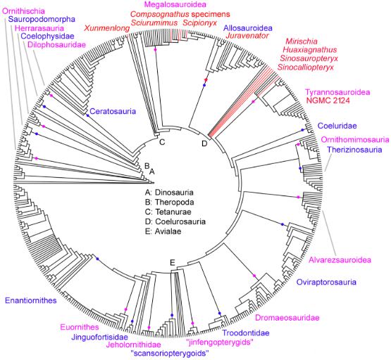 Cau classe ainsi Xunmenglong comme un membre basal de Tetanurae, Juravenator comme un allosauroidé au placement indéterminé, Scipionyx comme un spinosauridé probablement baryonychiné, Compsognathus et Sciurumimus comme des megalosauridés et enfin Sinosauropteryx, Sinocalliopteryx et Mirischia comme des coelurosaures basaux indéterminés. Cette réinterprétation du classement des « compsognathidés » permet de bien mieux comprendre l’anatomie des spécimens juvéniles de plusieurs clades de théropodes.