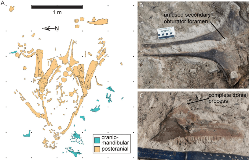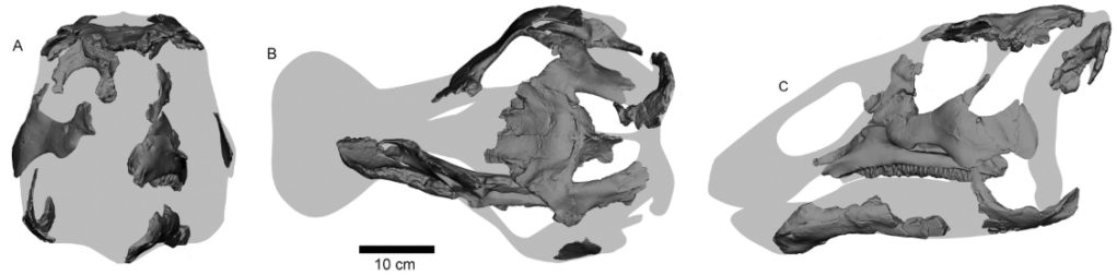 Référence : Sharpe, H.S.; Powers, M.J.; Dyer, A.D.; Rhodes, M.M.; Mcintosh, A.P.; Garros, C.W.; Currie, P.J.; Funston, G.F., 2024, Craniomandibular anatomy of a juvenile specimen of Edmontosaurus regalis Lambe, 1917 clarifies issues in ontogeny and biogeography. Journal of Vertebrate Paleontology. e2326644.
