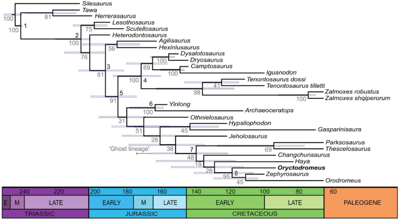 Krumenacker et ses collègues analysent ainsi les détails de l’anatomie d’Oryctodromeus cubicularis, en se basant sur l’holotype (MOR 1636a), le paratype (MOR 1636b) et les nombreux spécimens référés. Ils ont testé l’impact de leurs résultats sur le classement d’Oryctodromeus dans une analyse phylogénétique. Cette analyse classe Oryctodromeus comme un thescelosauridé orodrominé, taxon-soeur de Zephyrosaurus + Orodromeus. Les résultats de Krumenacker et ses collègues s’accordent ainsi avec les études précédentes portant sur les thescelosauridés.