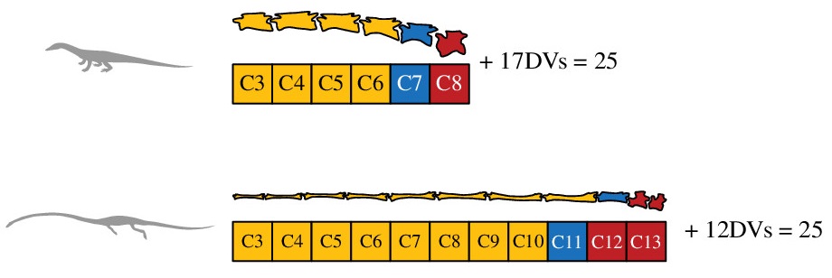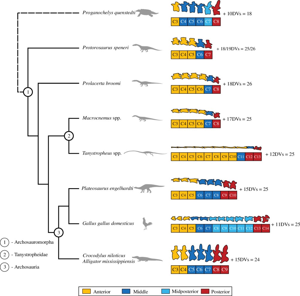 Rytel et ses collègues notent que la condition ancestrale des archosauromorphes est la présence de 25 vertèbres présacrales : 8 vertèbres cervicales et 17 dorsales. Alors que le tanystropheidé basal Macrocnemus possède ce nombre ancestral de vertèbres, Tanystropheus s’écarte largement de cette condition en présentant 13 vertèbres cervicales très allongées et 12 vertèbres dorsales. A noter toutefois que Tanystropheus conserve le nombre ancestral de 25 vertèbres présacrales. Rytel et ses collègues constatent ainsi que le changement du nombre de vertèbres cervicales et dorsales s’est fait au cours de l’évolution des tanystropheidés.