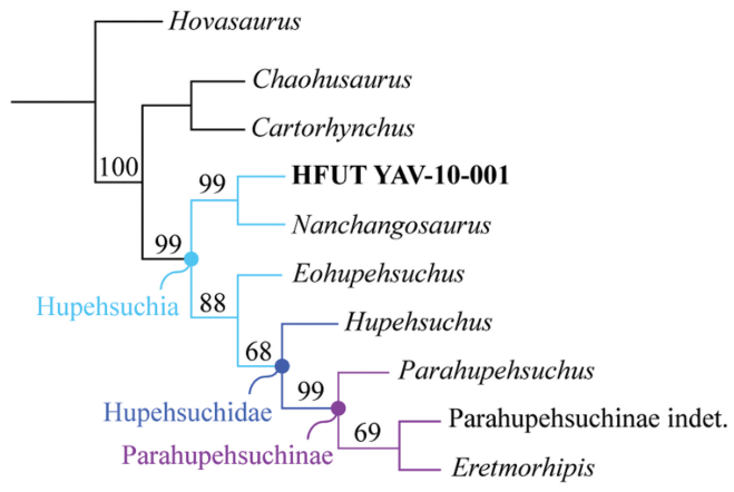 L’analyse phylogénétique de Liu et ses collègues a placé HFUT YAV-10-001 en taxon-soeur de Nanchangosaurus suni au sein d’Hupehsuchia. Cela confirme ainsi son attribution au genre Nanchangosaurus. L’attribution de HFUT YAV-10-001 à Nanchangosaurus permet de mieux connaître certains détails de l’anatomie du crâne et des membres de ce genre. Cela permet notamment de savoir que Nanchangosaurus possédait trois carpes proximaux, au moins trois carpes distaux et 5 doigts avec une formule phalangienne 2-2-2-2-1. Cela correspond bien à la condition ancestrale supposée des membres antérieurs des hupehsuchiens (voir cet article).