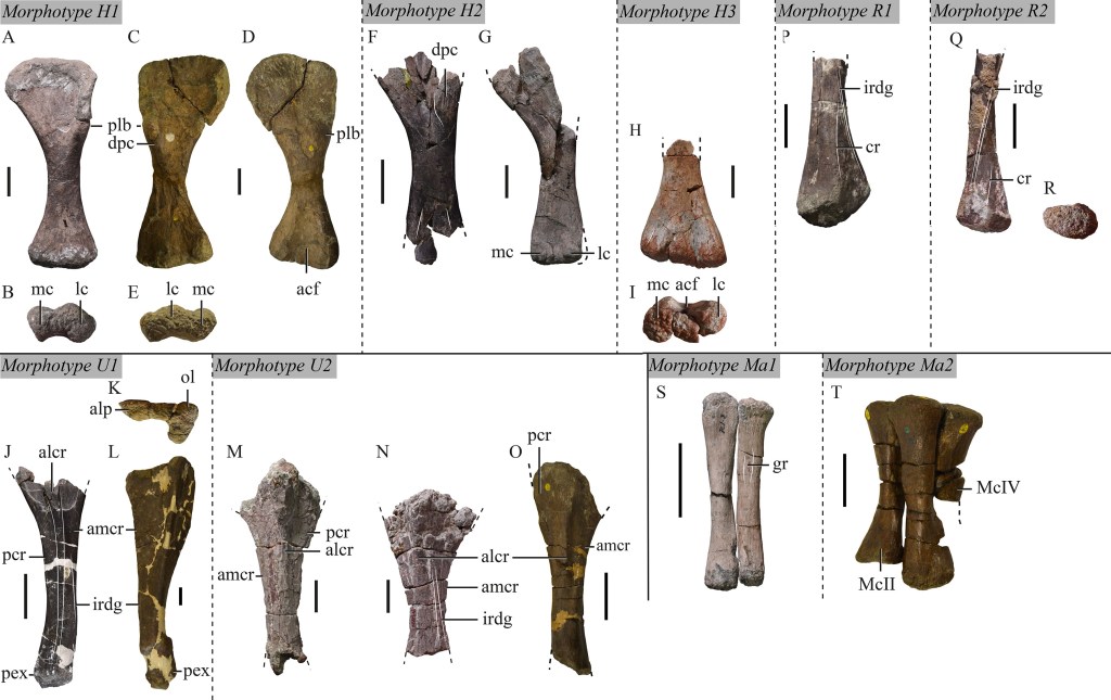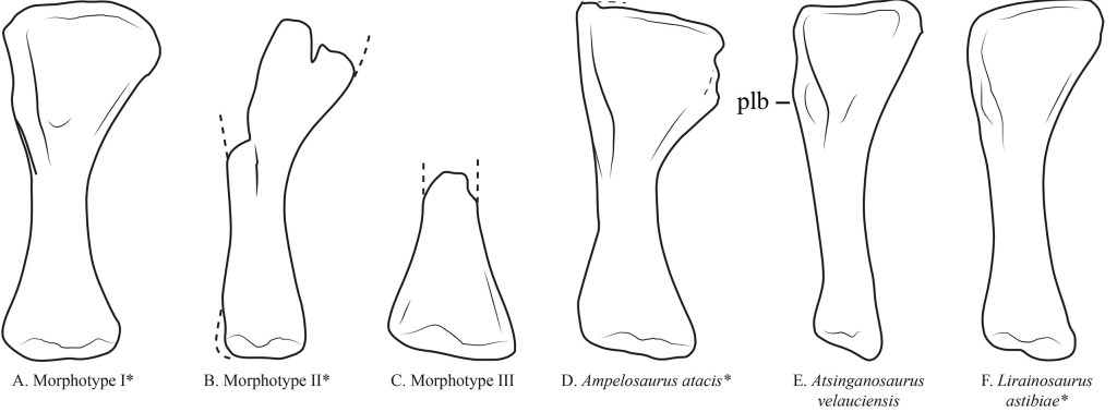 L’humérus UBB P.30 représente le morphotype H1 et l’humérus UBB PM-1 représente le morphotype H2. Le radius UBB NVM-3 représente le morphotype R1 et le radius UBB ODB-2 représente le morphotype R2. Le fémur UBB LcB 5 représente le morphotype F2 et le fémur UBB RM-1 représente le morphotype F5. La fibula UBB PUI P-149 représente le morphotype Fi1 et les fibulas UBB PT-1 et UBB 15.540 représentent le morphotype Fi2. Les morphotypes H1, R1, R2, F2, F5, Fi1 et Fi2 ainsi que le pubis UBB NV-80 peuvent représenter Magyarosaurus ou Paludititan mais H2 est un morphotype différent et non-lirainosauriné.