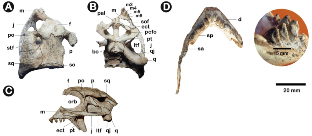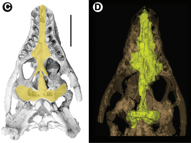 Références : Iori, F.V.; Ghilardi, A.M.; Fernandes, M.A.; Dias, W.A.F., 2024, A new species of vocalizing crocodyliform (Notosuchia, Sphagesauridae) from the Late Cretaceous of Brazil. Historical Biology.