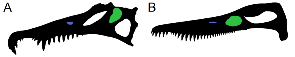 Spinosaurus est un genre de théropode spinosauridé longtemps resté énigmatique avant la découverte de restes supplémentaires. qui ont entraîné une vague d’études sur sa taxonomie, sa phylogénie et son écologie (voir par exemple cet article). Il existe actuellement deux hypothèses majeures sur son écologie : la première qui en fait un prédateur semi-aquatique chassant activement dans l’eau et la seconde qui en fait un prédateur chassant principalement au bord de l’eau. Afin de trancher entre l’une de ces théories, Smart et Sakamoto comparent le crâne de Spinosaurus avec celui d’autres sauropsides prédateurs.