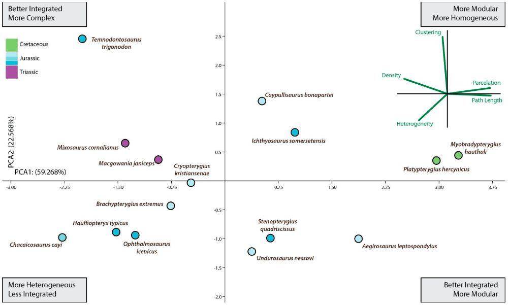 Cette analyse révèle également qu’au sein même d’Ichthyosauria, il existe une grande diversité de morphologies de nageoires malgré leur similitude globale. En effet, certains d’entre eux, comme Chacaicosaurus, Hauffiopteryx, Brachypterygius et Ophthalmosaurus, ont des phalanges moins connectées, rendant leurs nageoires plus hétérogènes. D’autres genres comme Ichthyosaurus et Caypullisaurus ont des connexions réparties presque uniformément, ce qui donne une nageoire très homogène.