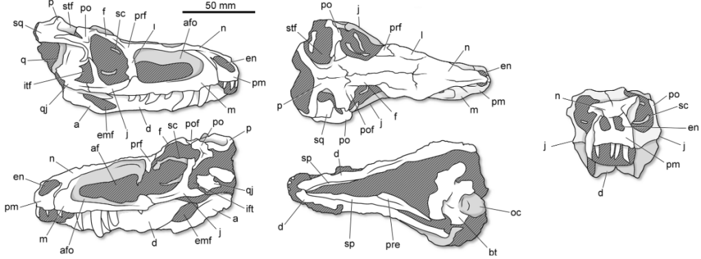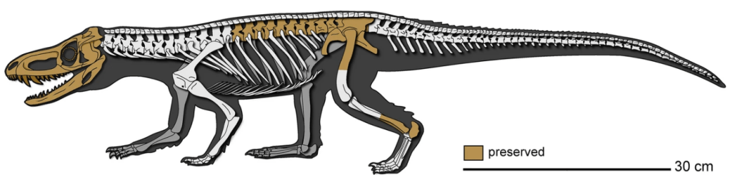 Référence : Müller, R.T., 2024, A new small-sized predatory pseudosuchian archosaur from the Middle-Late Triassic of Southern Brazil. Science Reports. 14: 12706.