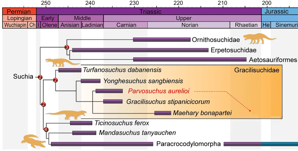 Il y a quelques années, Pedro Aurélio découvrit le squelette d’un petit pseudosuchien dans le Ladinien-Carnien de la formation géologique de Santa Maria (Rio Grande do Sul, Brésil). Müller décrit ainsi ce spécimen comme l’holotype d’un nouveau genre de gracilisuchidé, qu’il nomme Parvosuchus (« petit crocodile »), avec P. aurelioi pour espèce.