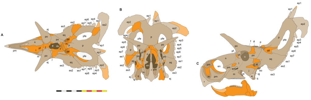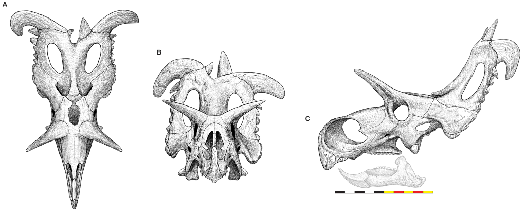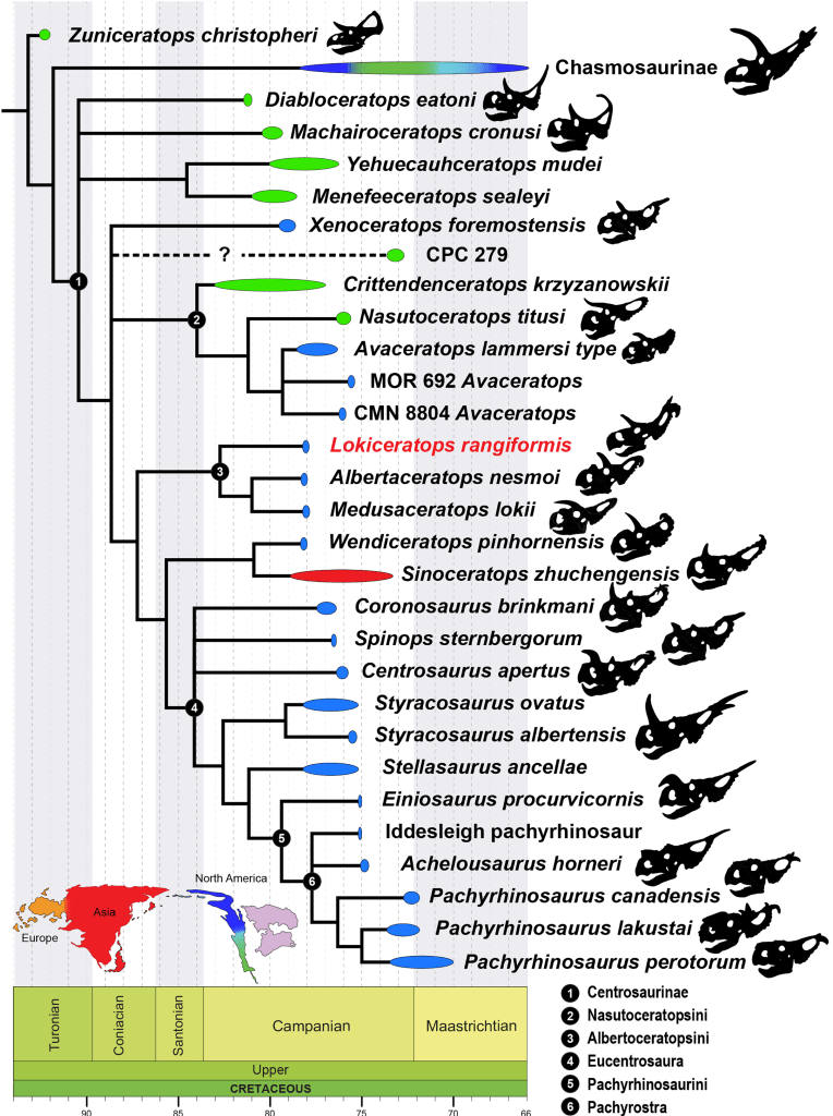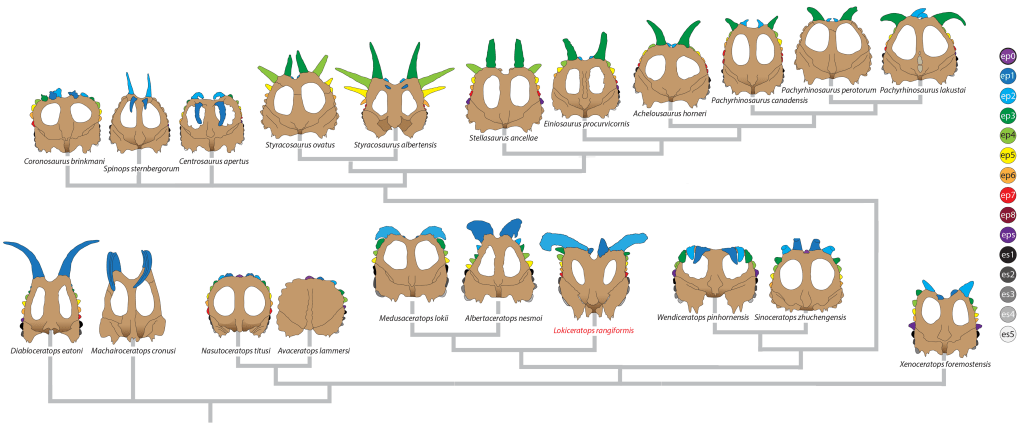 Référence : Loewen, M.A.; Sertich, J.J.W.; Sampson, S.; O’Connor, J.K.; Carpenter, S.; Sisson, B.; Øhlenschlæger, A.; Farke, A.A.; Makovicky, P.J.; Longrich, N.; Evans, D.C., 2024, Lokiceratops rangiformis gen. et sp. nov. (Ceratopsidae: Centrosaurinae) from the Campanian Judith River Formation of Montana reveals rapid regional radiations and extreme endemism within centrosaurine dinosaurs. PeerJ. 12: e17224.