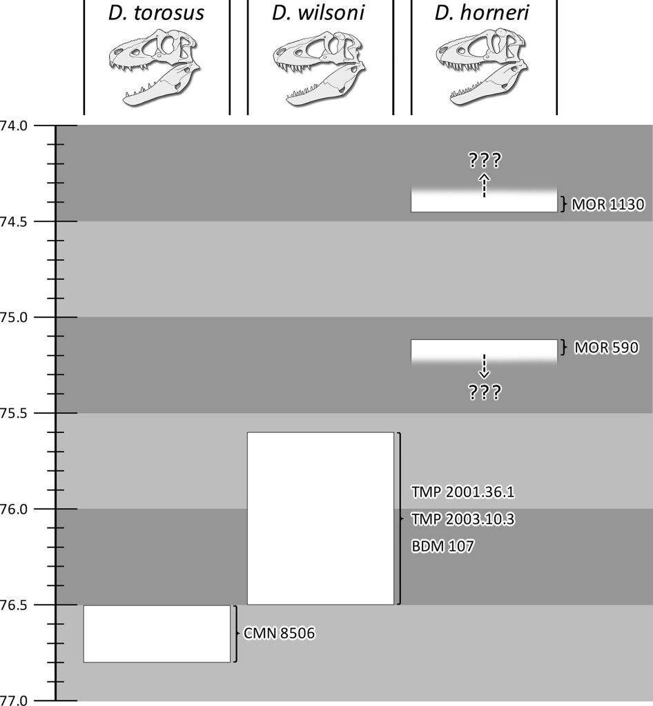 L’analyse phylogénétique de Warshaw et ses collègues classe les espèces de Daspletosaurus en espèces sœurs successives dans un Daspletosaurus paraphylétique. D. torosus plus basal que D. wilsoni, lui même plus basal que D. horneri. Ces espèces ne se chevauchent pas stratigraphiquement et qu’elles vivaient dans la même zone géographique. De plus, elles présentent des variations morphologiques qui semblent les faire évoluer petit à petit par un processus de transformation. Ainsi, comme cela avait déjà été suggéré, Warshaw et ses collègues en concluent que D. torosus a évolué en D. wilsoni, qui a évolué en D. horneri.