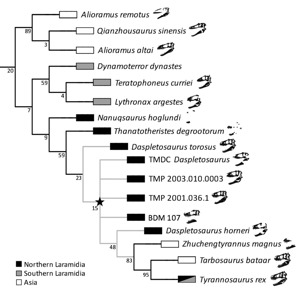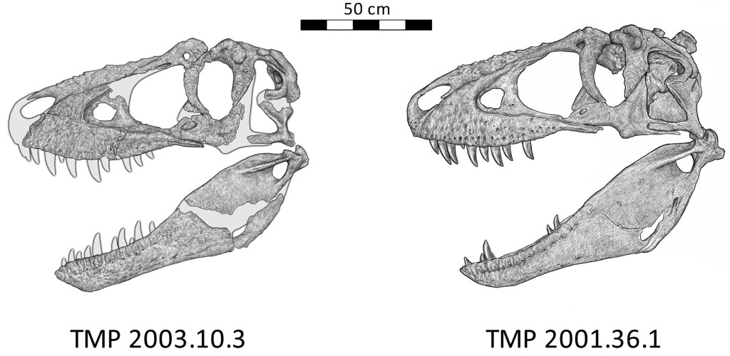 Références : Warshaw, E.A.; Guevara, D.B.; Fowler, D.W., 2024, Anagenesis and the tyrant pedigree: a response to “Re-analysis of a dataset refutes claims of anagenesis within Tyrannosaurus-line tyrannosaurines (Theropoda, Tyrannosauridae) ». Cretaceous Research. 105957.