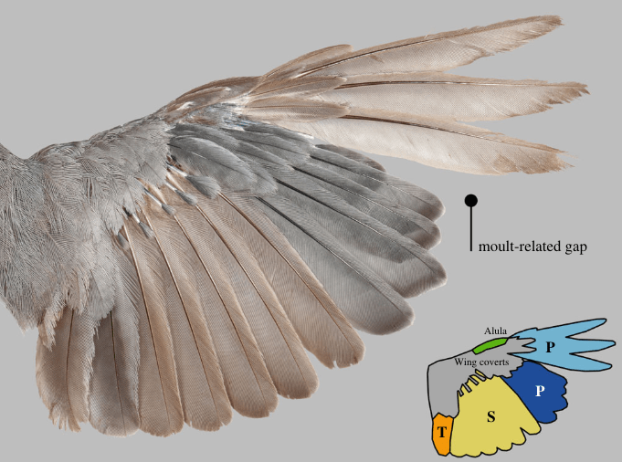 Wang et ses collègues remarquent que STM7-21 et STM7-22 présentent tous les deux des signes d’une mue du plumage. Chez ces spécimens, certaines rémiges primaires sont en cours de croissance de manière symétrique sur chaque aile, indiquant qu’elles étaient en train de repousser après une mue. Ces nouvelles plumes sont de couleur plus foncée, ce qui montre qu’elles étaient plus colorées que les autres plumes qui étaient plus vieilles et donc plus altérées.